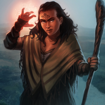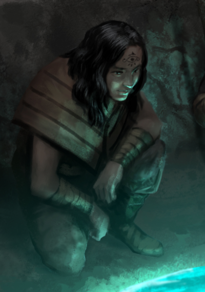 A Human witch with a simple wooden staff. Her brow is marked with the Eye of the Starlit Door in black ash. She has the ability to change people into animals and has considerable skill in potion-making.